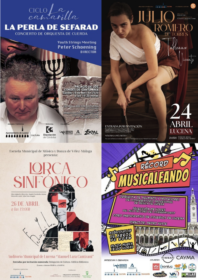 La programación continuará el 26 de abril con el concierto de “Lorca Sinfónico” en el Auditorio Municipal “Manuel Lara Cantizani” de la Orquesta Sinfónica de la Escuela de Música de Vélez-Málaga y la Coral Coraxalia. Esta propuesta, dirigida por la lucentina Ángela Fernández, plantea un recorrido sensorial por la vida y obra de Federico García Lorca, combinando música en vivo, teatro y danza.
