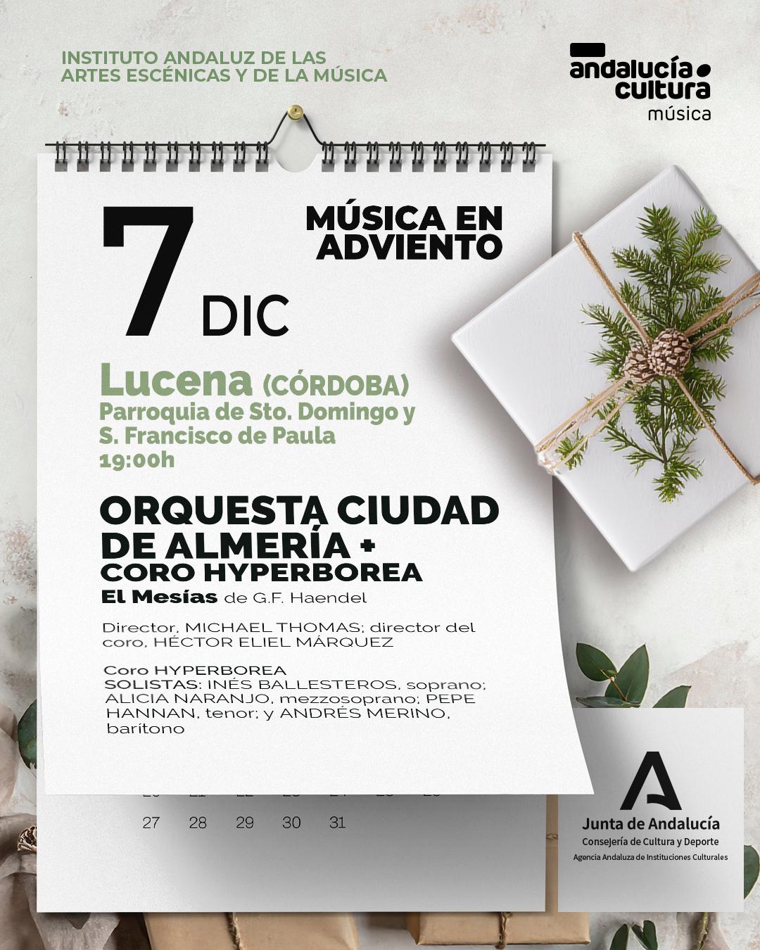 La Delegación de Cultura ha presentado hoy la llegada a Lucena del ciclo “Música en Adviento”, promovido por la Consejería de Cultura de la Junta de Andalucía y el Instituto Andaluz de las Artes Escénicas y de la Música, que traerá a la ciudad la interpretación de El Mesías de G. F. Haendel este próximo domingo 7 de diciembre, a las 19:00 horas, en la Parroquia de Santo Domingo.