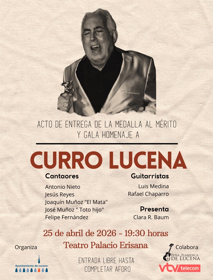 El Palacio Erisana de Lucena acogerá este próximo sábado 25 de abril, a las 19:30 horas, el acto de entrega de la Medalla al Mérito de la ciudad al cantaor Curro Lucena, seguido de una gala flamenca como homenaje a la figura y trayectoria de este artista lucentino.
