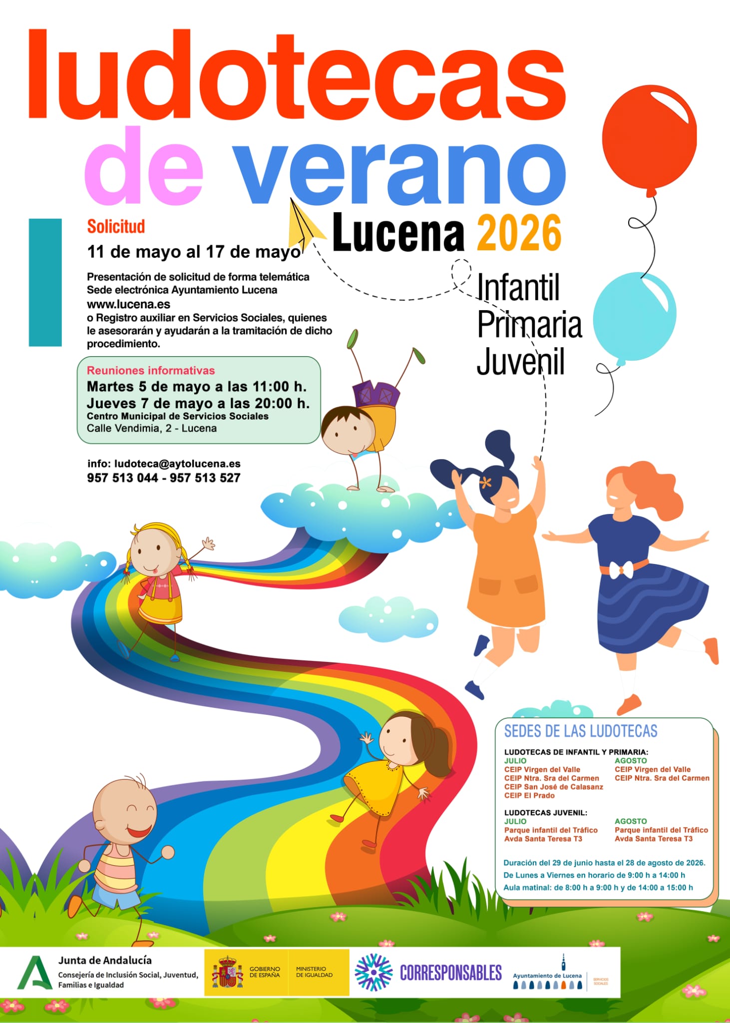 Además, se celebrarán sesiones informativas para resolver dudas sobre el funcionamiento de las ludotecas. Tendrán lugar el 5 de mayo a las 11:00 horas y el 7 de mayo a las 20:00 horas en la Delegación de Servicios Sociales, mientras que en las pedanías estas sesiones se realizarán el 6 de mayo a las 9:00 en Jauja y el 7 de mayo a las 9:00 en Las Navas, en sus respectivos colegios. Para más información, las personas interesadas pueden contactar a través del correo electrónico ludoteca@aytolucena.es o en los teléfonos 957 513 044 y 957 513 527.