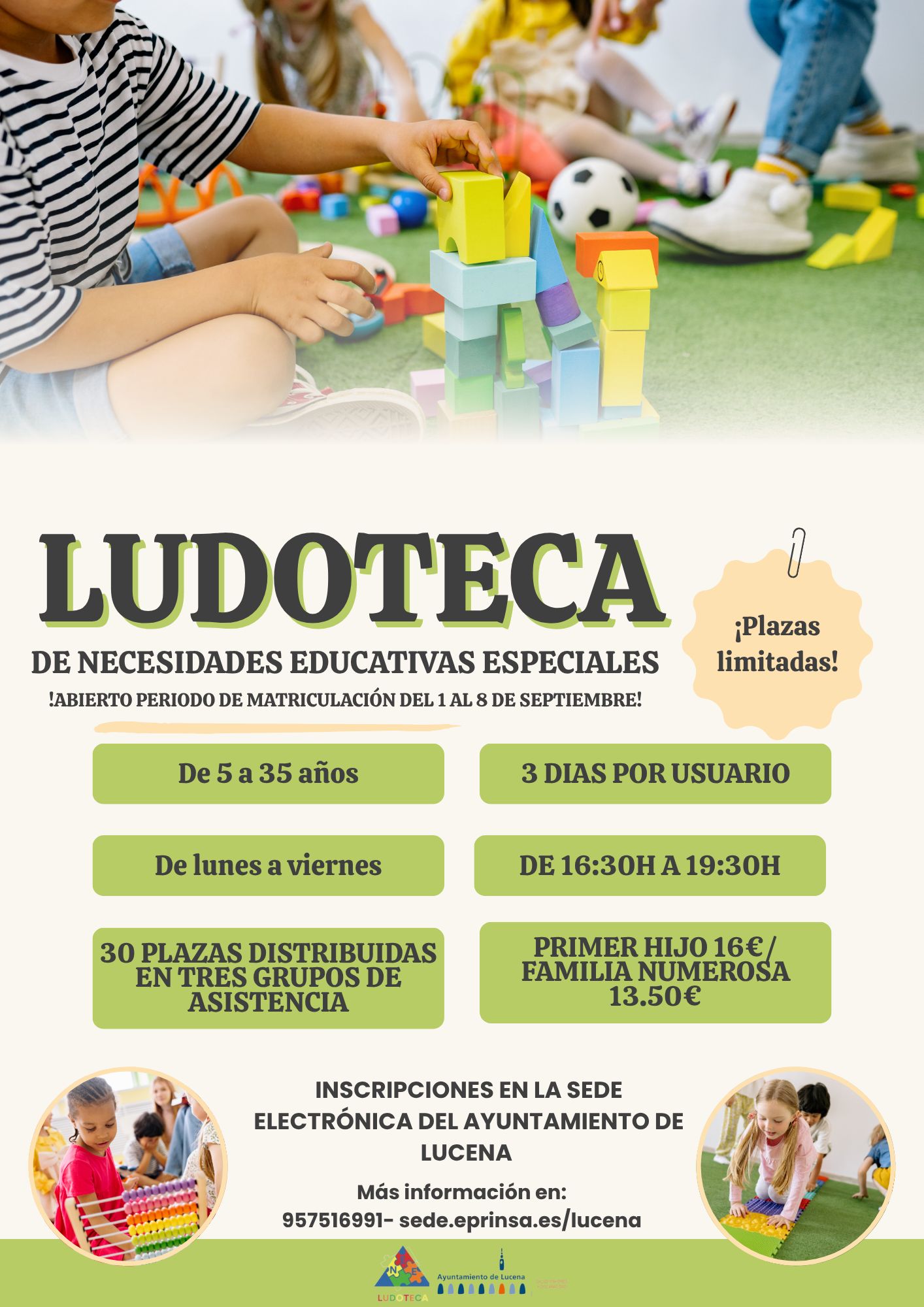 La Concejalía de Salud, Mayores y Discapacidad del Ayuntamiento de Lucena pone en marcha una nueva edición de la Ludoteca de Necesidades Educativas Especiales (NEE), abriendo el periodo de matriculación para el curso 2025/26 del 1 al 8 de septiembre, a través de la sede electrónica municipal.