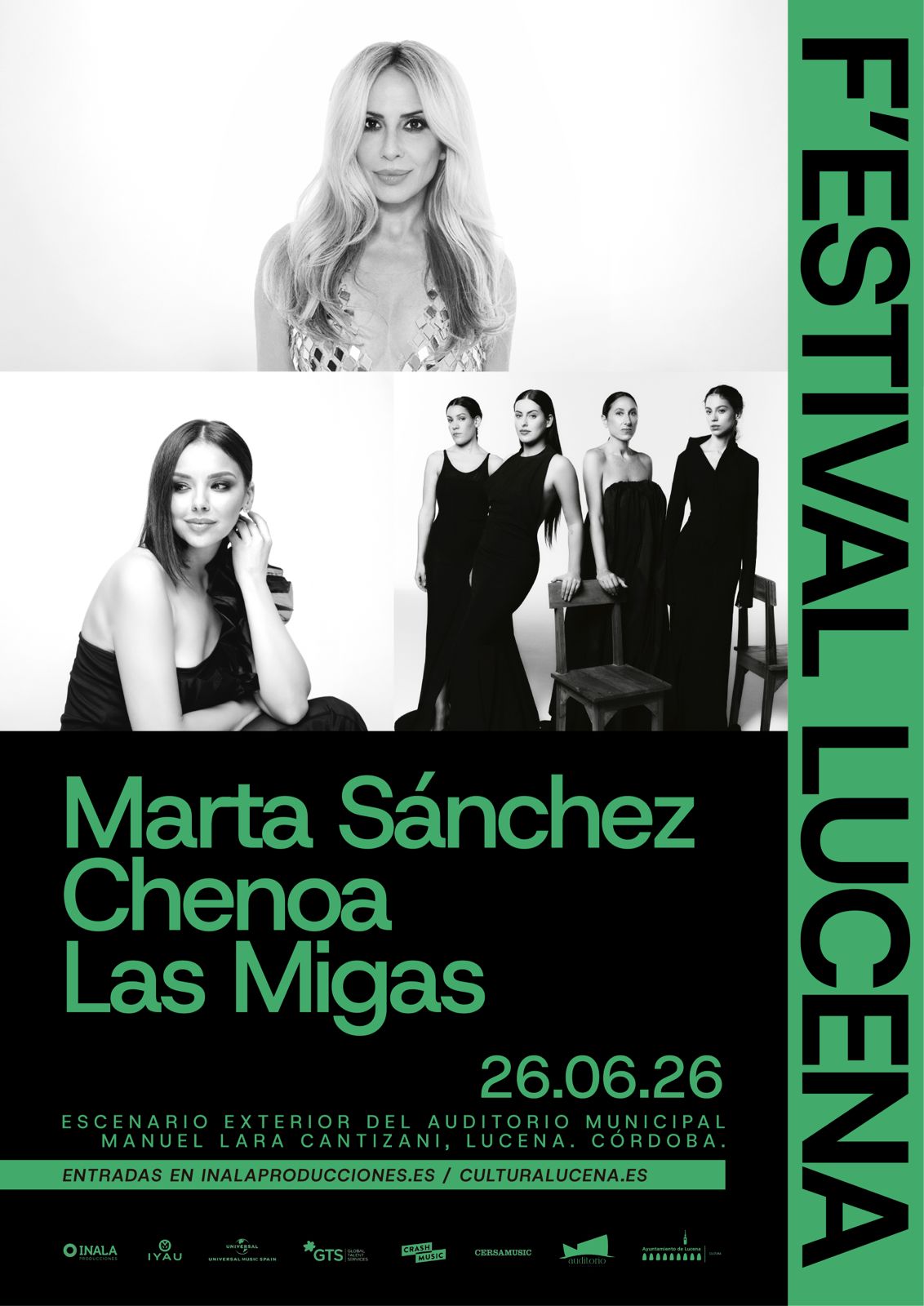 Marta Sánchez, Chenoa y Las Migas protagonizarán el gran concierto que la Delegación de Cultura del Ayuntamiento de Lucena ha organizado dentro del F’Estival Lucena 2026, el ciclo veraniego de conciertos y espectáculos de gran formato que se viene celebrando con éxito desde el año 2024. Así lo ha anunciado este martes el concejal de Cultura, Francisco Barbancho.