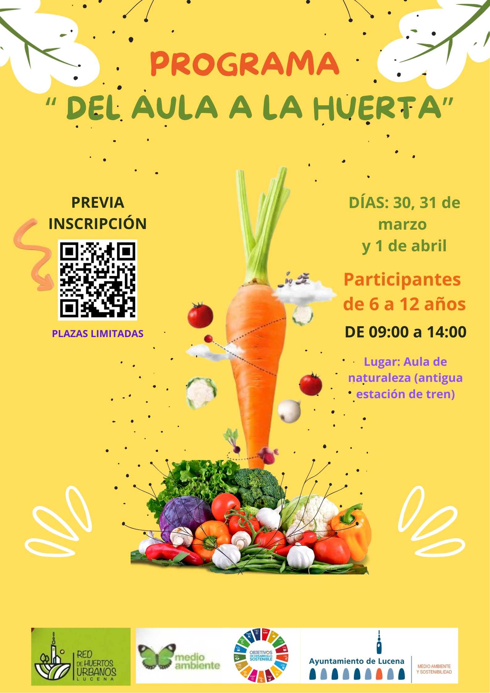 La tercera línea del programa se centra en la formación y la conciliación familiar a través del “Aula de Naturaleza”, cuyos contenidos integrarán los principios de “Del aula a la huerta” durante el periodo no lectivo de Semana Santa. Esta actividad, dirigida a alumnado de entre 6 y 12 años, se desarrollará los días lunes, martes y miércoles santo, en horario de 09:00 a 14:00 horas. Las inscripciones permanecerán abiertas hasta el 24 de marzo, con plazas limitadas que se asignarán por orden de llegada. Pincha en el siguiente enlace para acceder al formulario de inscripción.