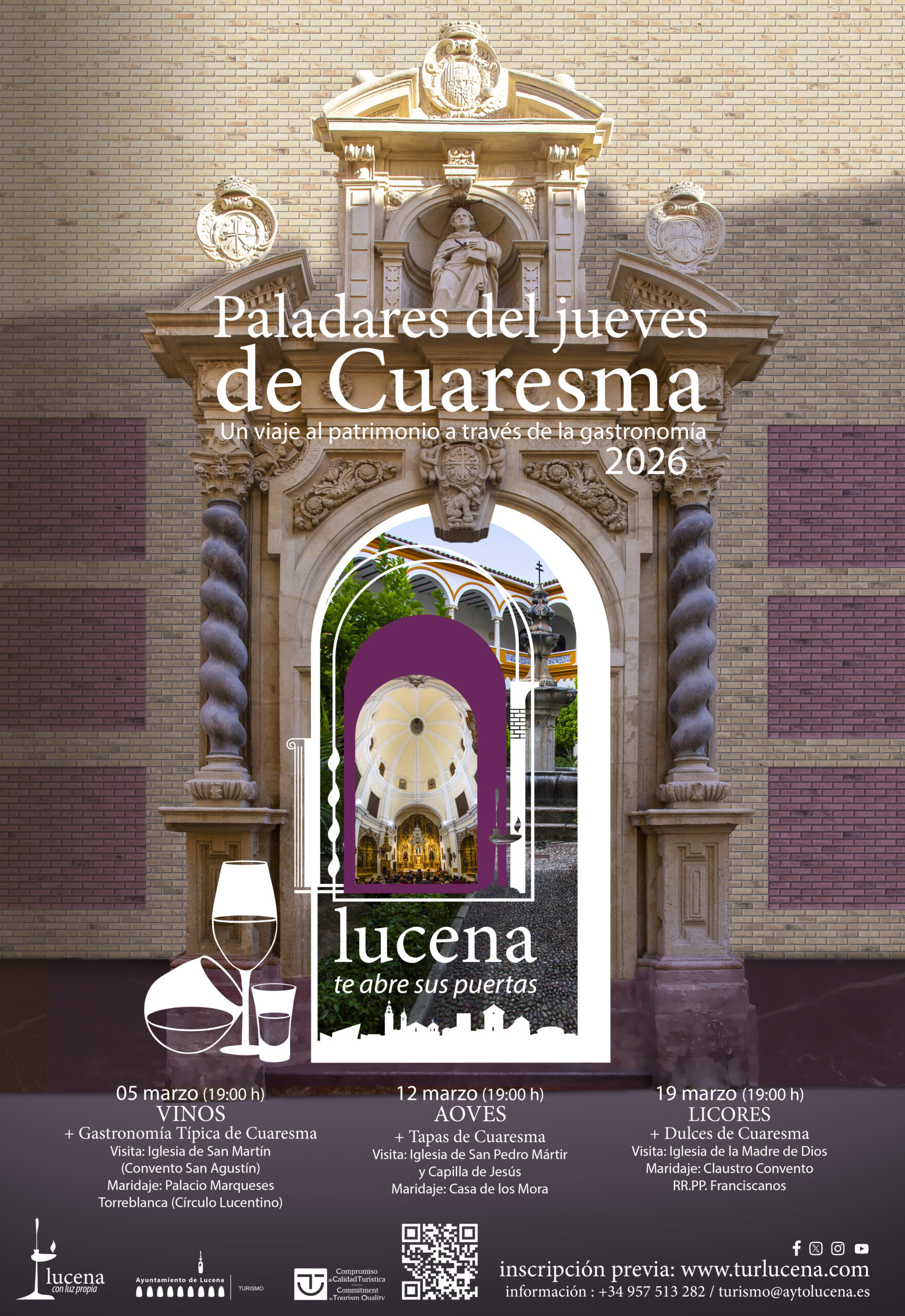 “Paladares de Cuaresma” se desarrollará en tres jueves consecutivos de marzo, cada uno centrado en una experiencia diferente. El 5 de marzo, con visita a la Iglesia de San Martín (Convento de San Agustín) y maridaje en el Palacio de los Marqueses de Torreblanca (Círculo Lucentino), centrado en vinos y gastronomía típica de Cuaresma; el 12 de marzo, con recorrido por la Iglesia de San Pedro Mártir y Capilla de Jesús y cata de aceites y tapas en la Casa de los Mora; y el 19 de marzo, visitando la Iglesia Madre de Dios y maridaje de licores y dulces en el Claustro de los RR.PP. Franciscanos. Cada experiencia combina una visita interpretada por guías oficiales y un maridaje gastronómico, ofreciendo un recorrido completo por la tradición y el patrimonio de Lucena.