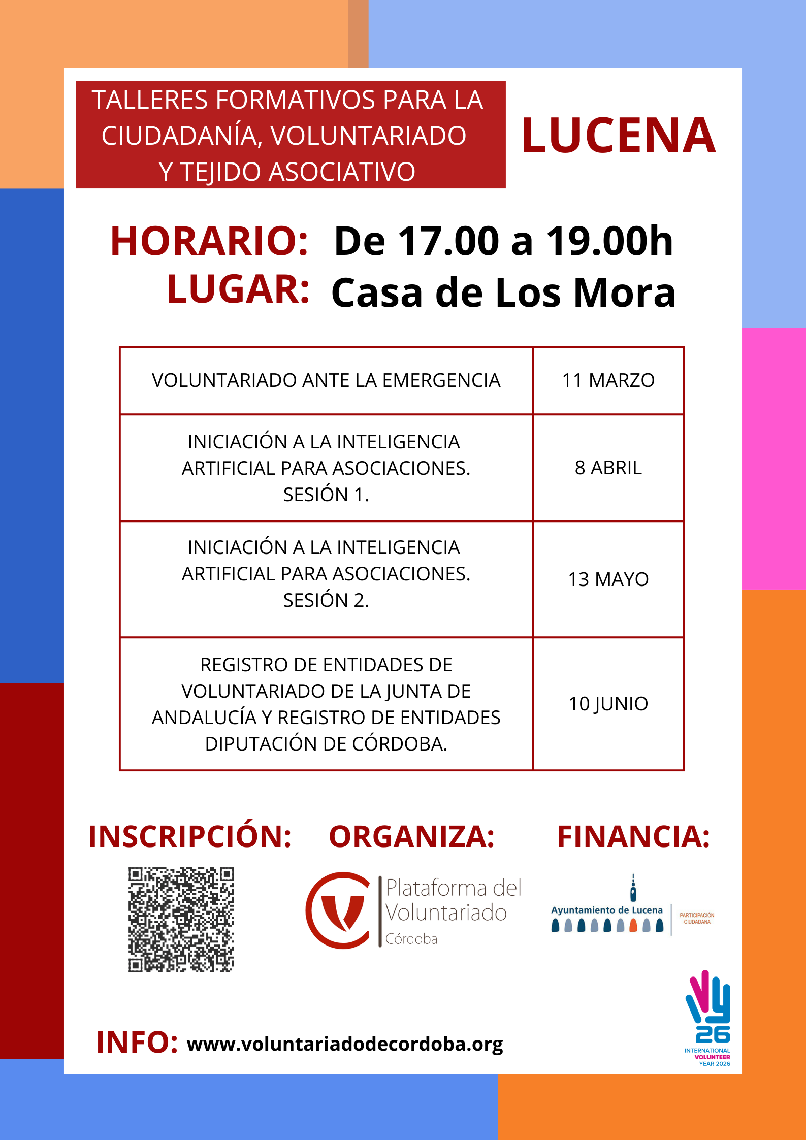 El programa, impartido por la Plataforma del Voluntariado de Córdoba, se desarrollará en la Casa de los Mora en horario de 17:00 a 19:00 horas, con una sesión mensual hasta el mes de junio. La asistencia es gratuita y las plazas son limitadas, incluyendo la entrega de un certificado de participación. Las inscripciones se pueden realizar a través del código QR del cartel o mediante este enlace.